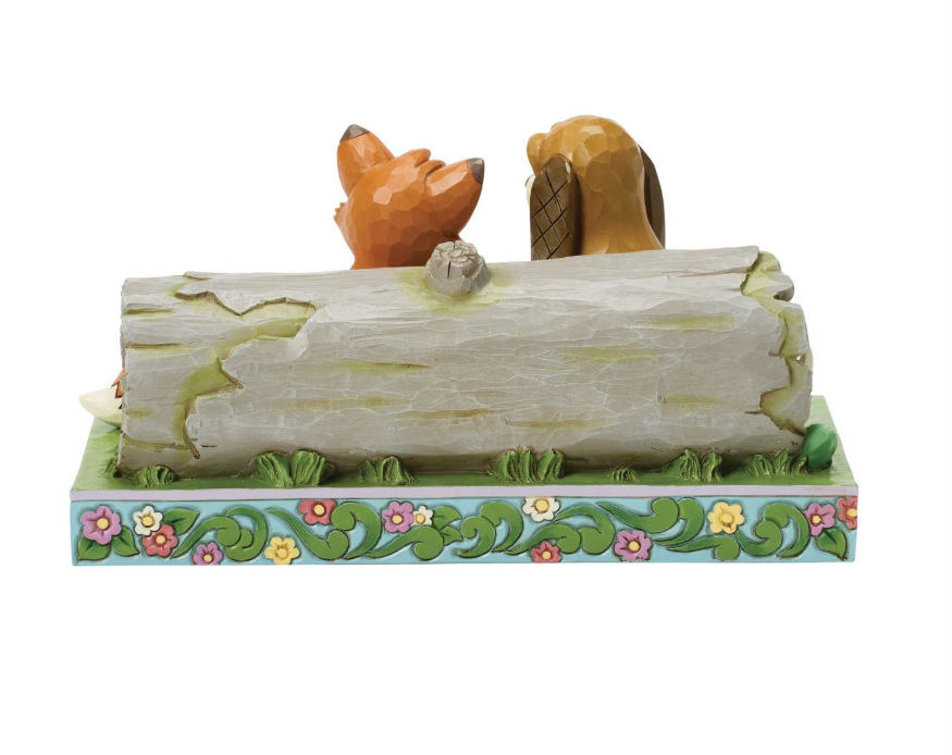 Celebrate the unlikely friendship between Fox and the Hound in this charming Jim Shore scene. As they play in the woods, Jim Shore's iconic rosemaling, patchwork patterns, and floral details bring the vibrant scene to life.