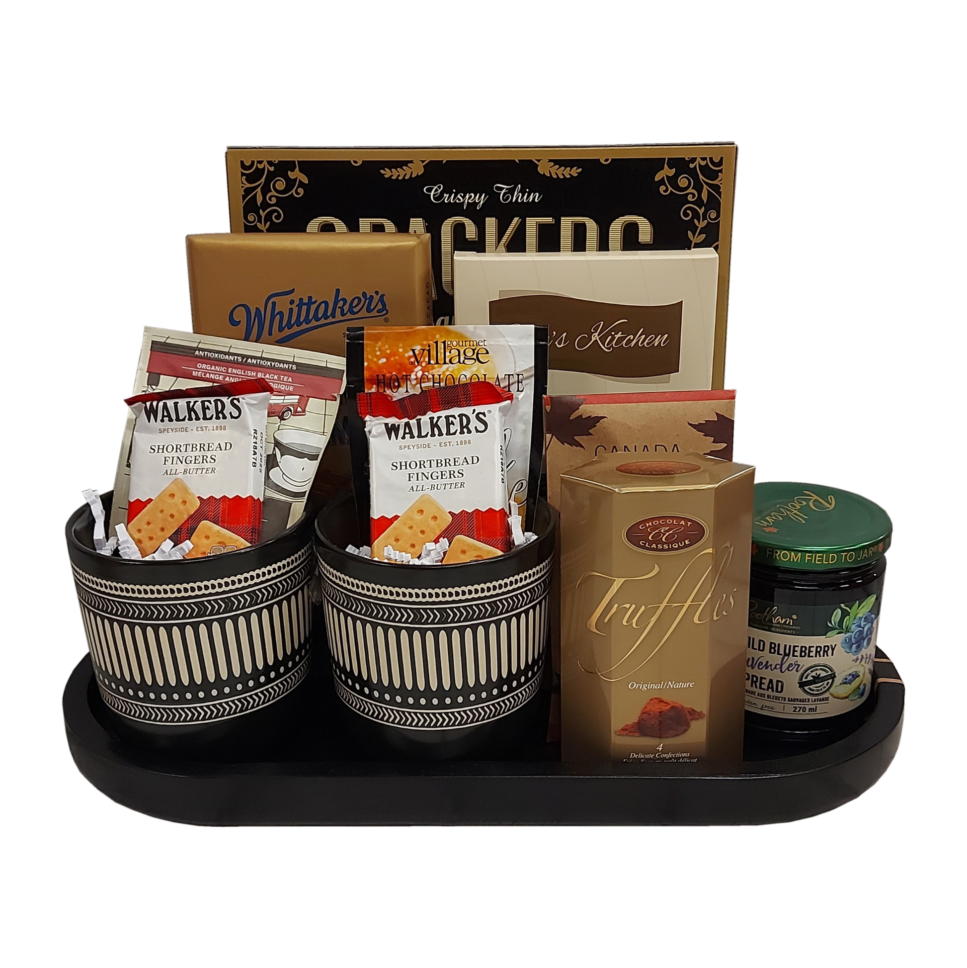 Enjoy this basket which includes two mugs, a delicious Roothams jam, chocolate fudge, hot chocolate, along with a variety of chocolates, and cookies displayed on a bamboo tray.